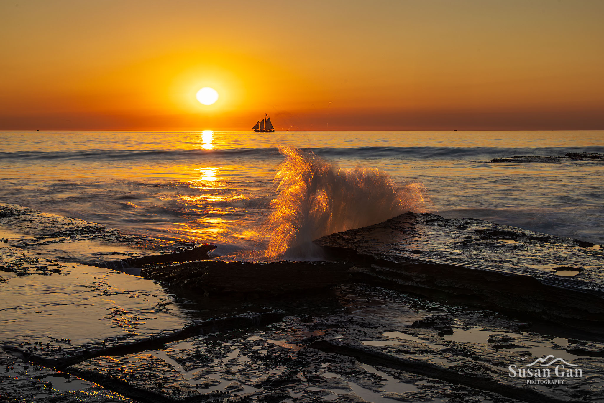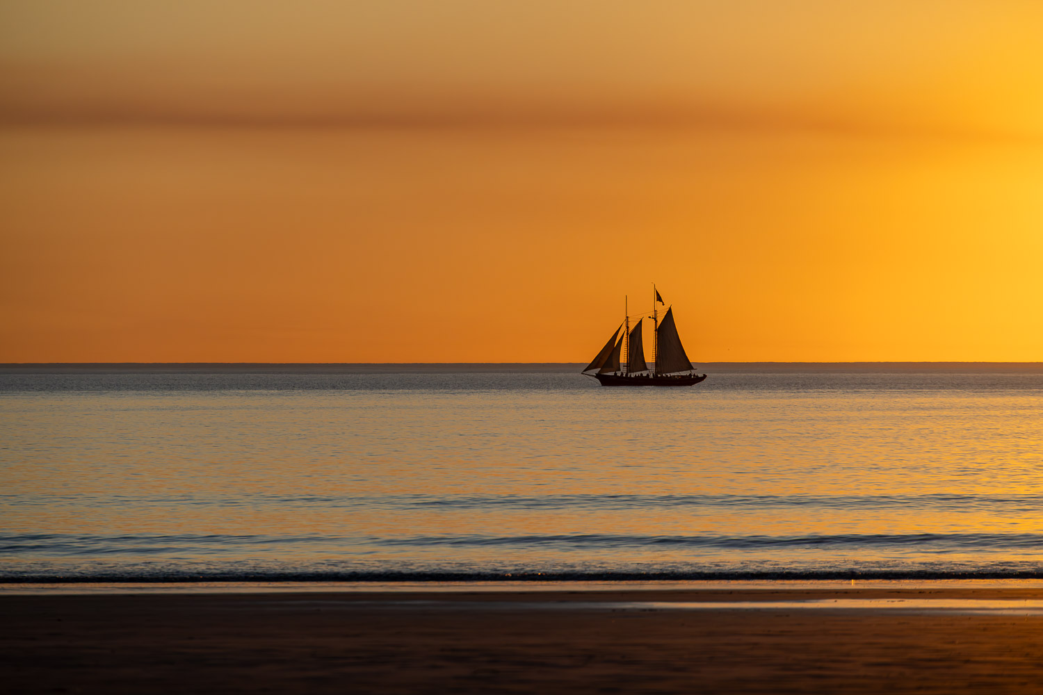 The wide sands of Cable Beach stretched out under a sky painted in soft oranges, the result of smoke drifting from a nearby bushfire. The sun sank slowly toward the Indian Ocean, its light reflecting on the wet sand and shallow pools left by the tide.